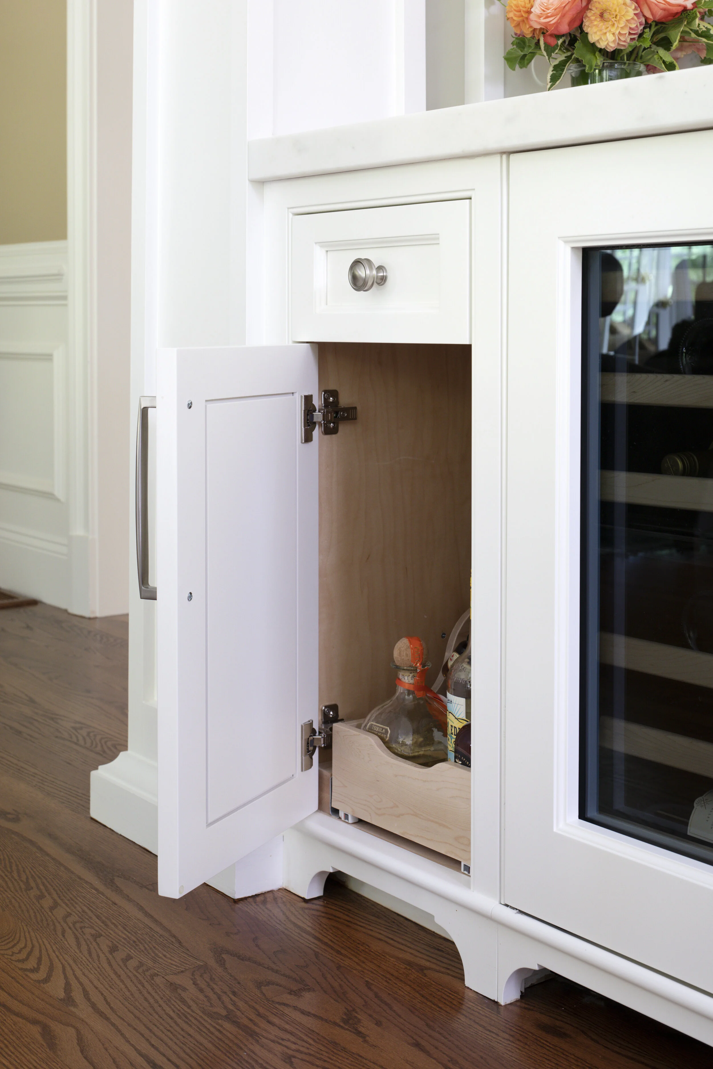 The exterior wall of this kitchen bumped in making a straight run of cabinetry, plus a larger refrigerator that the clients wanted, impossible. The solution? Bump back that exterior wall to give the clients the kitchen they desired. Custom Platt Cabinetry, layers of molding and millwork, and extensive kitchen accessories make this kitchen every cook’s dream.